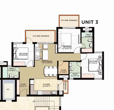 A relatively spacious flat (by Indian apartment standards) with 3 bedrooms + store + 3 bathrooms, useful for a family.